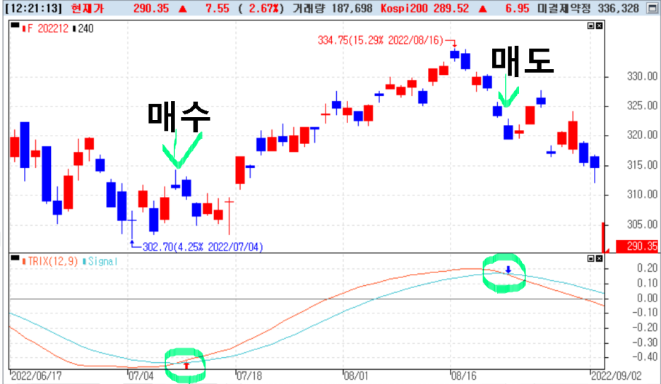 다음은 코스피지수 선물입니다. 기본적인 사용법은 그냥 이동평균선과 크게 다르지 않습니다. 단기지표(9일선)가 장기선(12일선)을 상향 돌파하면 매수 관점 반대로 단기지표가 장기 지표를 하향 돌파하면 매도 관점입니다.