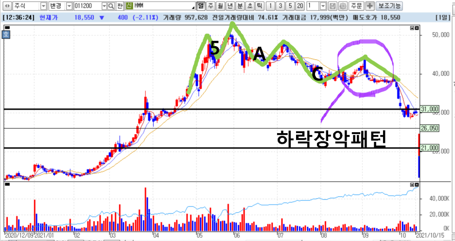 우리 상담 종목인 HMM입니다. 전형적인 하락장악형 패턴인데요. 네이버 지식백과에서 말하는 상승추세에서 발생하는 경우는 드물고 실전에서는 장기 상승추세가 왠지 꺾일 것 같은 느낌의 긴가민가 한때 불현듯 생기는 경우가 많습니다. 때문에 당연히 예상하기 힘들고 만약 보유종목에 이런 패턴이 나타나면 현실 부정하며 절대 이렇게 끝날 리가 없어 하며 인정하지 않으려 하는 경향이 있습니다. 왜 그런지 조금 다른 각도에서 봅시다.
