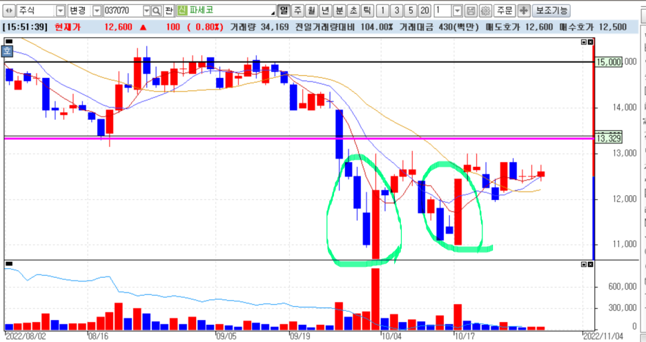 주식은 이렇게 말로 입을 털어봤자 실전차트로 공부를 해야 진짜죠 한번 실제차트에서 어떤식으로 적용이 되는지 알아 봅시다. 일단 개인적으로 상승장악형이 나온다는 얘기는 세력들이 잡고 있는 주식이 아니면 잘 나오지 않습니다. 그래서 그냥 우리 상담종목의 대표적인 세력주 바로 파세코를 무작정 차트를 띄어 봤습니다.