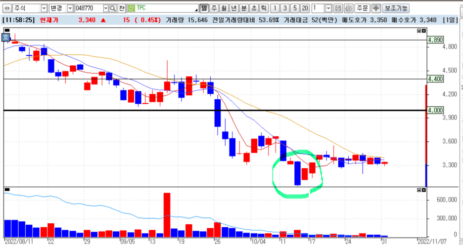 우리 상담 종목인 tpc입니다. 바닥권에서 상승 잉태형이 나왔습니다. 그리고 바닥 대비 약 18프로 정도 상승이 나왔는데요. 그렇지만 그 후 얼마나 상승했냐는 다른문제인고 문명 상승 잉태형 이후에 매매할 만한 타이밍이 있었다고 보는 게 상승 잉태형을 보는 옳은 자세일 거라고 봅니다. 하지만 물론 잉태형 후에 좋은 흐름을 보이는 종목도 굉장히 많습니다. 이걸 꼭 상승 잉태형 때문이라고 보기는 해석의 차이가 있겠지만, 기본적으로 저 때가 투자자들의 심리가 바뀌는 초기 지점이라는데 의의가 있다고 할 수 있겠죠.