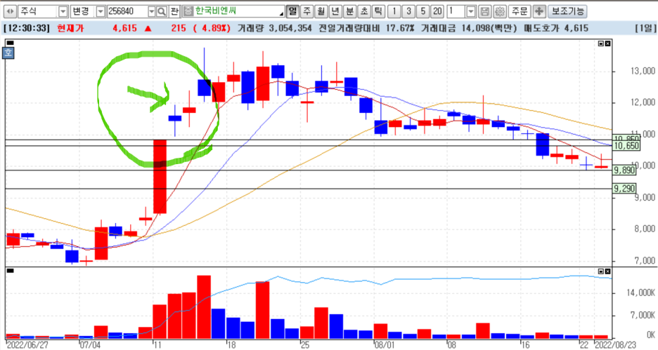 우리 상담 종목인 한국비엔씨 입니다. 첫번째 예부터 안되는 패턴이네요. 왜 이것을 가장 처음 선택했냐하면 그냥 그냥 보여서 한것도 있고 다른면으론 하락 십자형 패턴자체는 아무런 의미가 없다는것을 보여주기 위해서 입니다. 아무런 의미가 없다는거 자체가 어찌보면 틀린표현이지만 적어도 십자형 패턴다음에 어떤 양봉일지 음봉일지 예측하는거 자체가 큰 의미가 없다는 것은 진리이죠. 하지만 왜 저 자리에서 저런식으로 십자형 도지캔들이 나왔는지는 중급이상 차트분석을 할줄 알게 되면 누구나 알 수 있습니다.