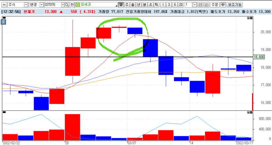 우리 상담종목인 파세코입니다. 실전차트 패턴에서 너무나도 많이 등장하는 패턴인데요. 갭이 없어서 저녁별 패턴인지 좀 실시간 차트에서는 좀 아리송할수도 있을것 같은데 그럼에도 저녁별 패턴이 어떻게 만들어 지는지 원리를 알면 이런 차트에서도 응용할 수 있습니다.