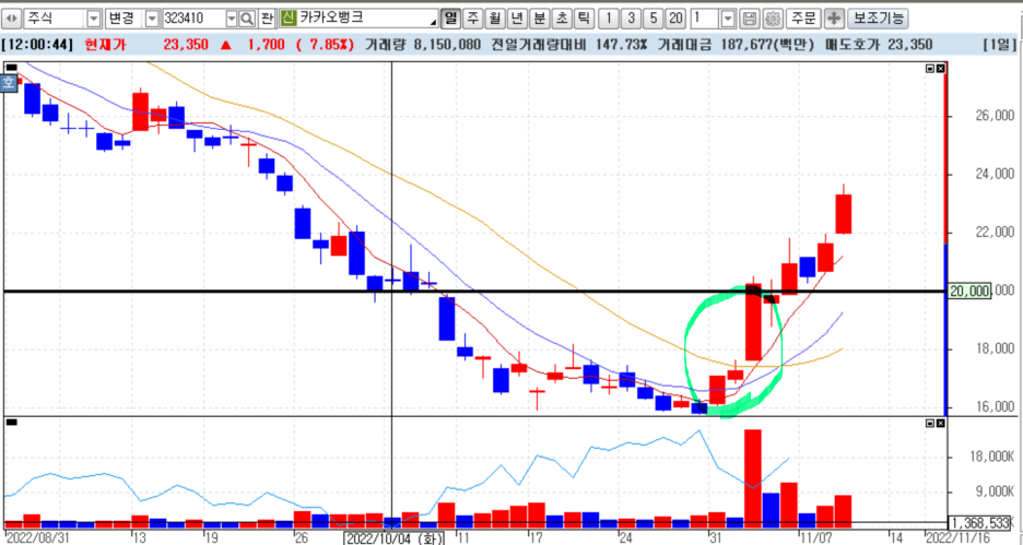 이번엔 우리 오개망종 종목인 카카오뱅크네요. 역시 적삼병이후 큰 상승을 하고 있는데요. 보기엔 저래보여서 무려 바닥에서 50프로 이상 상승하고 있습니다.