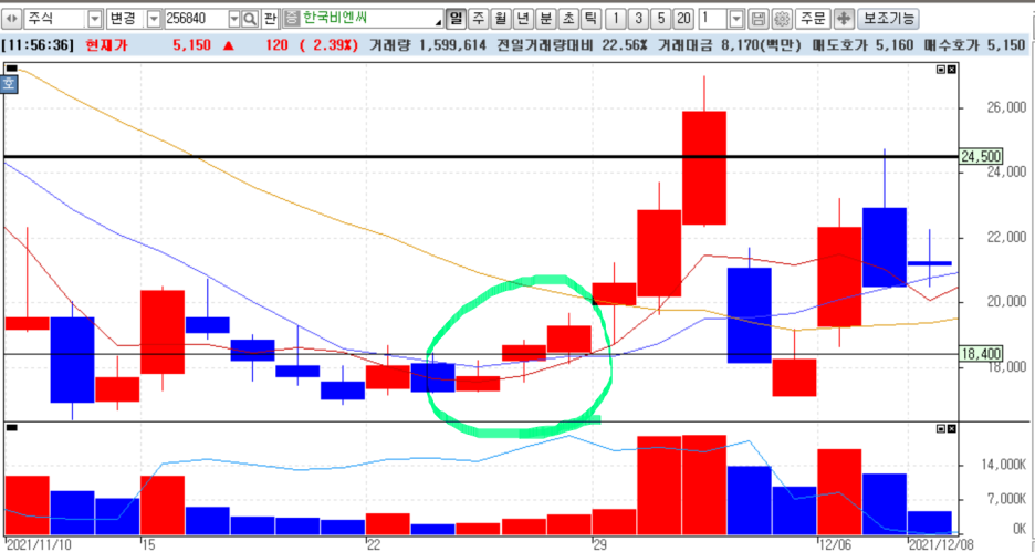 한국비엔씨입니다. 큰하락이 끝나는 시점에 추세가 바뀌는 시점에 맞춰서 적삼병이 나오는 모습을 볼수 있습니다. 적삼병이 출현한후 약 100프로 조금 안되게 상승 했습니다.