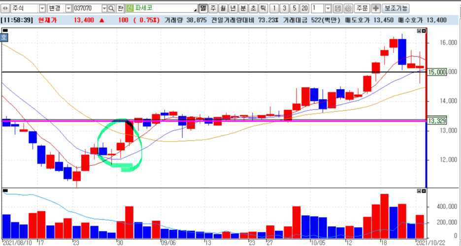 파세코역시 적삼병의 출현후 강력한 상승을 하게 되는데요. 약 80프로정도 상승했습니다.