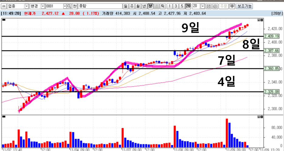 하지만 그 다음 세개의 양봉은 적삼병으로 우리가 이해할 수 있습니다. 물론 11.7.일의 양봉이 다소 좀 맘에 들지 않지만 그것을 다음날 충분히 만회했기 때문에 우리는 어느정도 인정해 줄 수 있을것 같습니다. 그렇다면 11.8일의 마감시황을 한번 볼까요? 제가 시황 뿐만 아니라 다른 어디에서도 단타하라고 하진 않지만 단타해볼 타이밍이다고 한 이유는 바로 여기서 이해할 수 있습니다. 왜냐하면 왠만하면 손실볼 확률이 적으니까..그말은 적삼병의 특징을 말하는겁니다.
