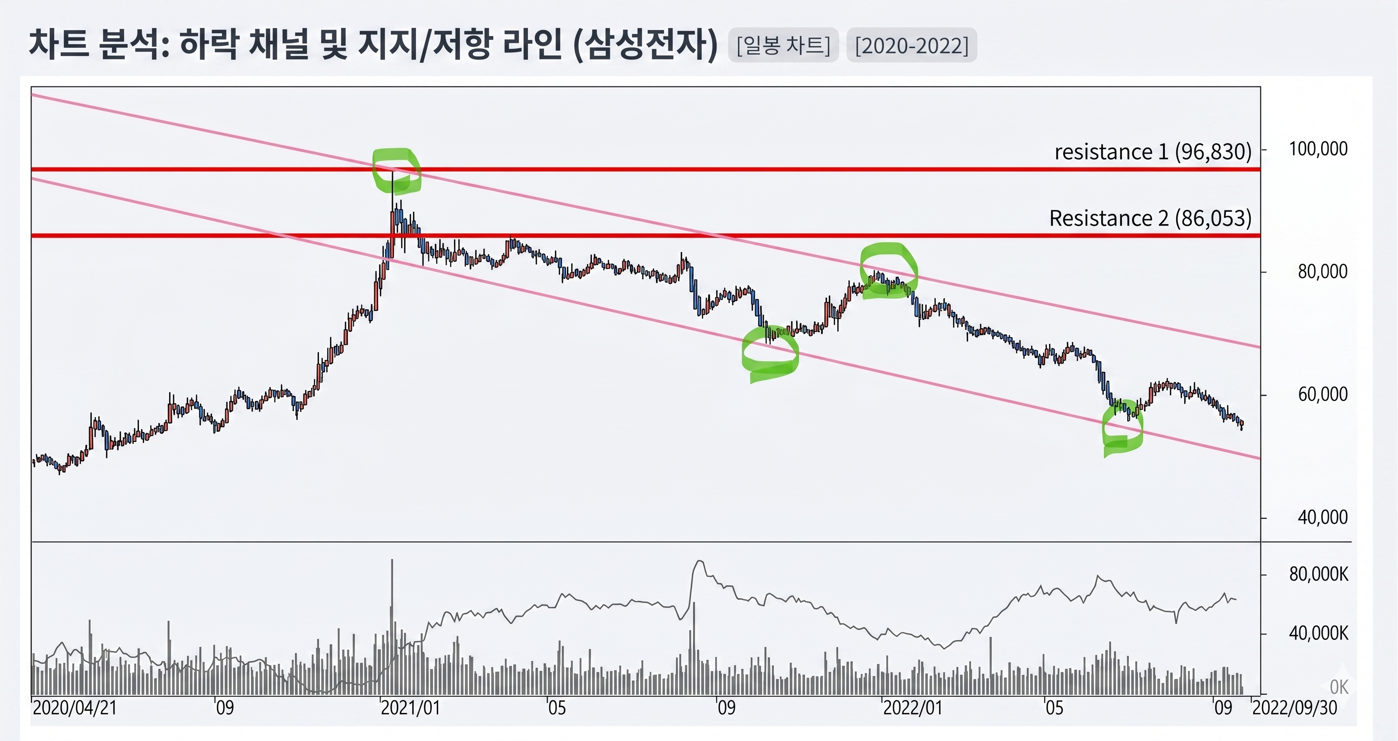 삼성전자의 일봉 차트에서 저점들을 연결해 보면 현재 하락 추세 라인이 형성됩니다. 이 라인을 따라가다 보면 "아, 다음 반등은 대략 4만 5천 원 언저리에서 나오겠구나"라는 직관적인 예측이 가능해집니다.