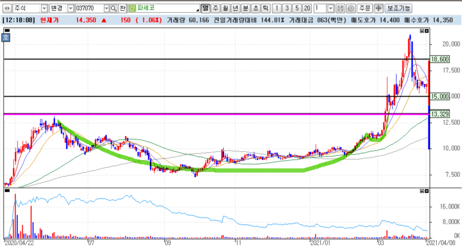 이정도면 충분히 도전해 볼만한 자리 아니었습니까? 그런데 왜 그랬을까요? 그건 바로 컵의 몸통이 나오기 전에 모두가 인정할만한 상승이 없었던게 바로 그 이유였지 않을까 생각합니다. 근데요...그것없이도 컵위드 핸들 패턴에서 잘 상승하는것도 많습니다. 하지만 제가 생각하는 근본적인 실패의 원인은 그냥 이 주식이 세력주가 아니기 때문이라고 봅니다. 만약 세력주였다면 절대 저렇게 만들지 않았을 거라고 봅니다. 단순히 시장의 기대로 움직이고 뉴스로 움직이는 신규주이기 때문에 긴가민가 하는 패턴을 만들고 대충보고 덤벼드는 투자자들을 엿먹이고 또 상승시키고 갈만하면 또 빼버리는 패턴을 주구장창 만들겠죠. 그러면서 세력들이 차곡차곡 자신의들 포지션을 만들어 갈거라고 봅니다.