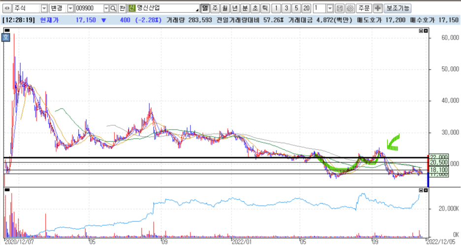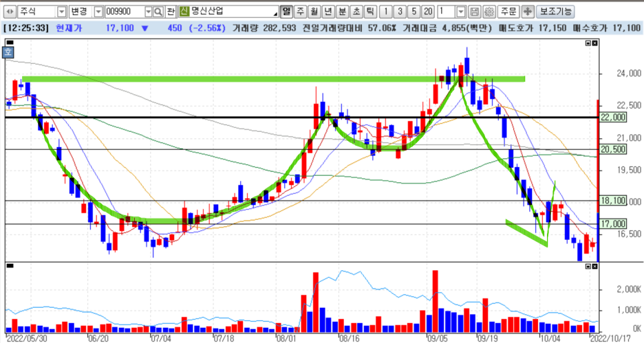 우리 상담종목인 명신산업인데요. 물론 컵의 바닥부분이 조금 의심이 가긴 하지만, 투자자에 따라선 충분히 가능하다고 볼수 있을것 같습니다. 사실 저역시 이정도면 괜찮지 라고 생각됩니다. 분명 컵의 손잡이 부분에서 돌파매매할만 포인트가 나왔기 때문에 기대해 볼만도 했는데...급락해 버렸습니다. 이부분을 좀 넓게 볼까요?