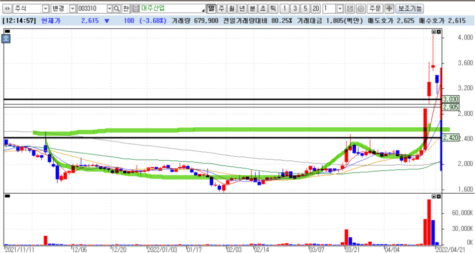 우리 상담종목인 대주산업 입니다. 전 보자마자 이거 세력주구나 하는 생각이 듭니다. 세력주들의 특징이 바로 이런 패턴을 만드는게 특징입니다. 저 긴횡보처럼 보이는 컵의 바닥이 보이시나요? 저거 생각보다 견디기 힘듭니다. 세력들은 꼭 골파기를 하면서 개미들을 터는게 아닙니다. 저런식으로 시간을 끌어 버리면 대부분의 개미들은 손절합니다.