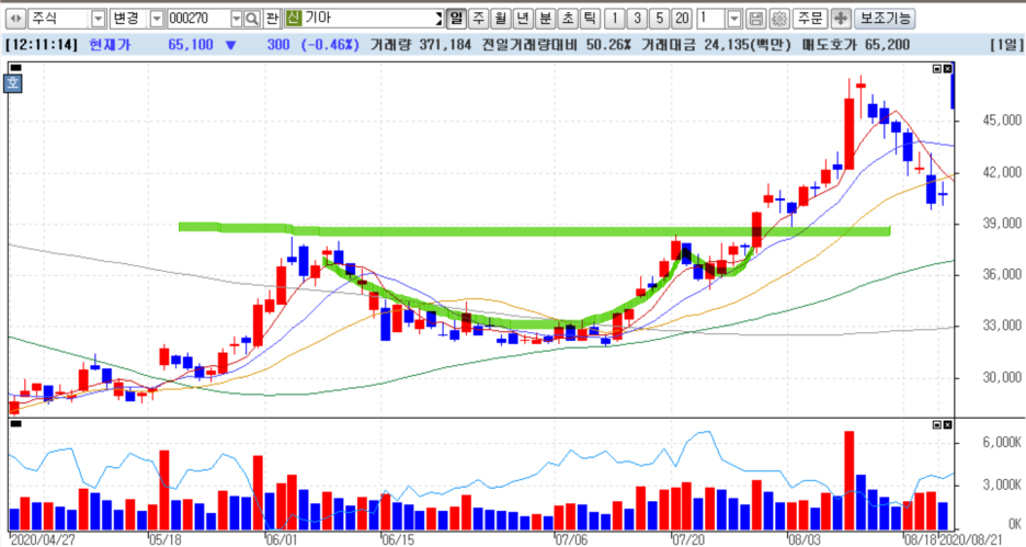 우리 상담종목인 기아인데요. 과거 2020년 5월의 상승인데요. 명확한 컵위드 핸들의 패턴이 나왔습니다. 물론 꼭 그 패턴이 아니더라도 여러가지 다양한 패턴의 중복이 보이긴 하지만요 그래도 이정도면 누구나 컵위드핸들 패턴이라고 인정할듯 합니다. 기아에서 핵심 매수포인트는 바로 저 전고돌파할때가 매수 포인트 겠죠.