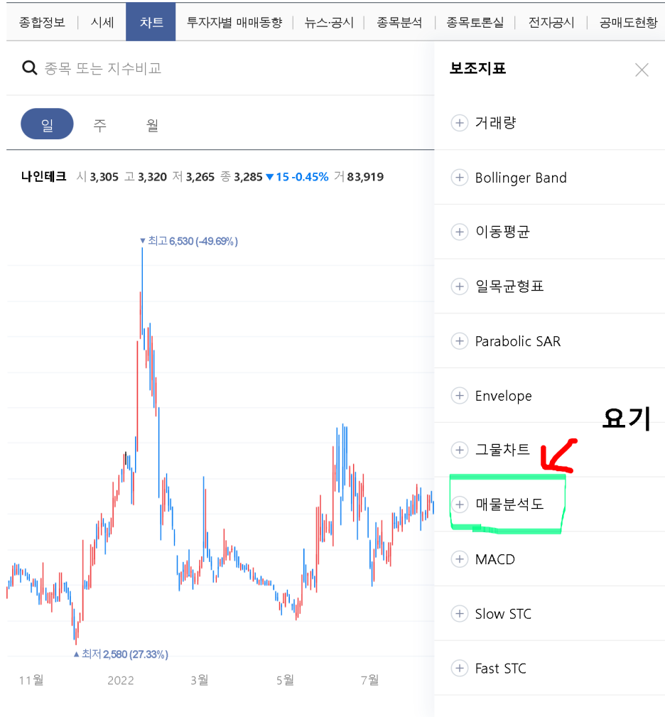 네이버-증권-종목선택-차트-보조지표탭으로 들어가면, 이렇게 옵션을 선택할수 있습니다. 매물분석도를 보조지표에 추가하면 이렇게 변합니다. 좀더 자세히 나누고 싶다면 설정에서 좀더 세밀하게 나누면 됩니다.