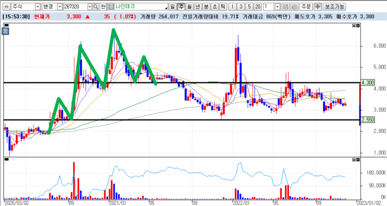 나인테크의 주봉인데요. 상담내용중에 4300원을 돌파해야 오히려 비중을 늘릴수 있다고 말했었는데요. 물론 이말이 꼭 매물대만을 보고 한말은 아니었지만, 지금은 매물대를 설명하는 입장이니 그런 관점에서만 봅시다. 그렇다면 4300원이 매물대라는 건데 차트에서 어떻게 알수 있는지를 설명하는것은 너무 복잡하고 방대해져서 쉽게 알수 있는 방법에 대해서 알려드릴께요.