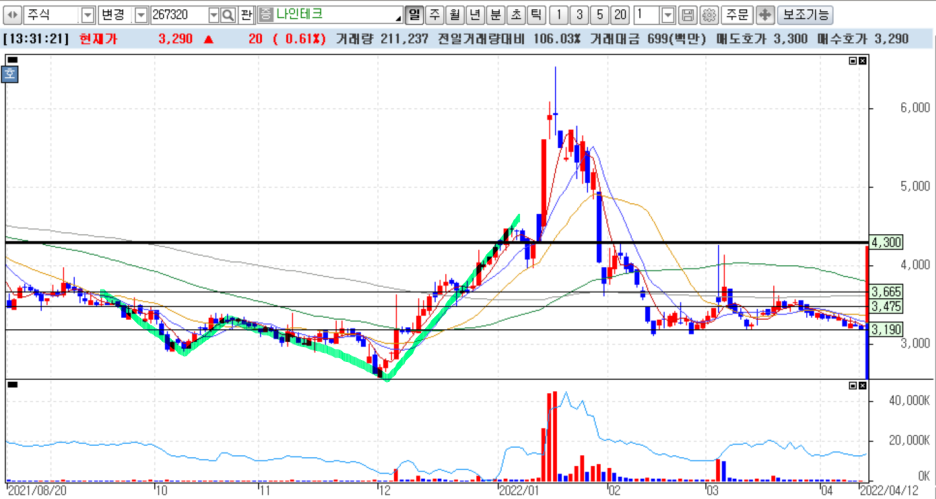 얼마전에 우리 상담종목인 나인테크죠. 여기서도 우리가 쌍바닥을 만들며 급등하는 모습을 만들고 있습니다. 앞서살펴본 지수의 쌍바닥 패턴과는 좀 다른 모습이네요. 우리는 주식은어로 골파기라고도 부릅니다. 그냥 보기엔 쌍바닥 만들면서 상승했네라고 생각할수 있지만, 처음에 말했듯이 쌍바닥이 완성된후 복기하듯이 보는 차트는 너무너무 쉽습니다. 하지만 문제는 우리는 모든게 실시간 아닙니까? 저렇게 쌍바닥을 만드는 시점에 저점에서도 무려 11프로나 급락시키며 하락시켜 버릴때 과연 견딜수 있는 투자자가 몇이나 될까요? 아마도 아무것도 못해서 주식을 덮어버리는 투자자가 아니라면 많이 손절 했을 거라고 봅니다. 하지만 결국은 바닥을 만들면서 급등을 시켜 버리죠.