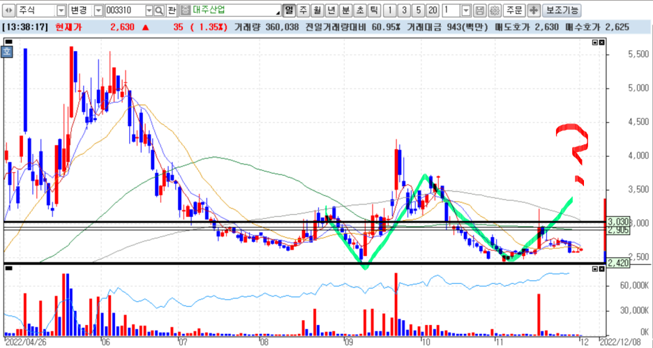 우리 상담종목인 대주산업입니다. 이런 쌍바닥이 우리에게 가장 쉽고 익숙한게 사실입니다. 뭔가 바닥을 지지해 주는듯한 쌍바닥말이죠. 여러분도 이런 쌍바닥인 참 애매하지 않습니까? 그건 실력이 부족해서가 아니라 원래가 애매한것 입니다. 때문에 이런 상황일때는 투자자들이 관망모드에 들어가기 때문에 배팅이 들어 오지 않습니다. 그래서 매수가 죽어 버리고 거래량도 죽어 버리게 됩니다. 그런데 경험이 적은 투자자들은 왠지 이때가 엄청나게 싸게 느껴지게 됩니다. 그래서 크게 배팅해버리게 되죠. 그때부터 도박이 시작되는 겁니다.