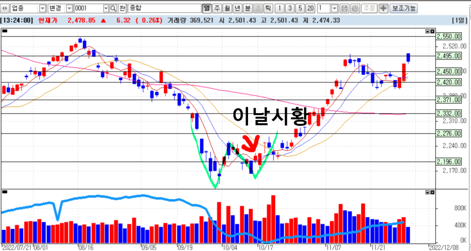 쌍바닥하면 아무래도 우리지수를 보지 않을수가 없죠. 왜냐하면, 우리가 이미 10월중순에 쌍바닥을 만들면서 2500포인트까지 반등하고 있는 시점이기 때문이겠죠. 그렇다면 실제로 2022.10.14.일 마감시황때 시황을 어떻게 말하고 있는지 볼까요? 아마도 여러분이 차트를 공부하는데 각각의 날짜별로 시황이 어떻게 진행되고 있다는것을 이렇게 기록으로 볼수 있다는 것은 대단한 행운일거라고 봅니다. 어디서 이런 자료를 보겠습니까?