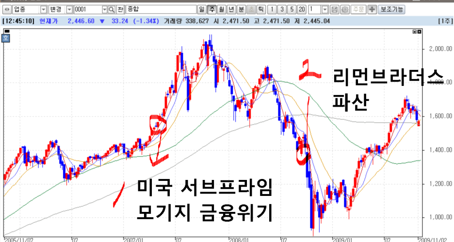 2007년 4월 아마도 금융회사 내부적으론 분명 모기기 사태가 터질거라는것을 알았다고 봅니다. 하지만 오히려 주가를 급등 시켜버리고 큰물량들이 빠져나갈 시간을 충분히 줬다고 봅니다. 그 증거가 바로 헤드엔숄더 패턴입니다. 우리가 이 패턴을 보면 끝났다고 긴장해야 되는 이유가 바로 여기에 있는 겁니다. 만약 내 주식에서 이런 패턴이 보였다면 앞으로 그 주식은 10년은 보면 안됩니다. 그리고 나서 2008년에 리먼 브라더스가 파산하면서 개박살 나게 됩니다.
