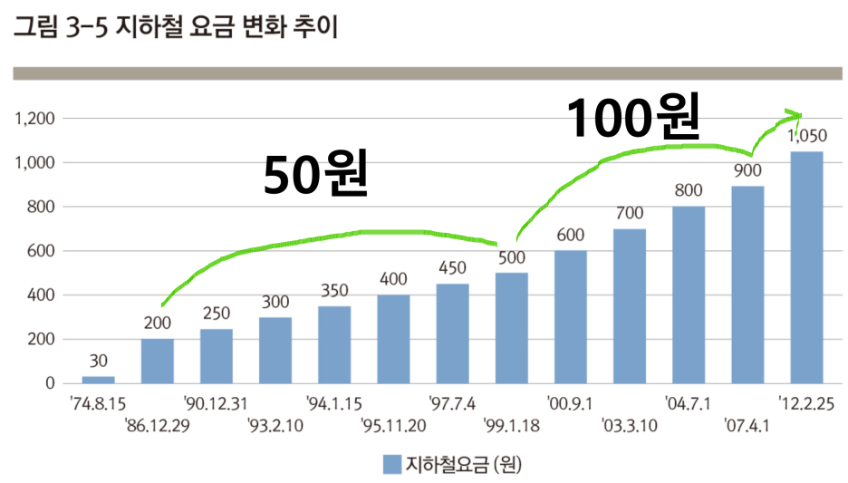 서울 지하철요금인데요^^ 지금보니...감회가 새로운데요. 어렸을때 500원이면 끝에서 끝까지도 갔었는데요. 표를 보면 500원까지는 50원씩 요금이 인상되다가 500원부터는 100원씩 인상됩니다. 지금은 더하겠죠^^. 즉 물가인상이 어떤 특정 가격에서 큰폭으로 상승하는 그 구간이 바로 라운드 피겨값입니다. 지하철요금표에선 500원이 라운드 피겨값이 될것같습니다.