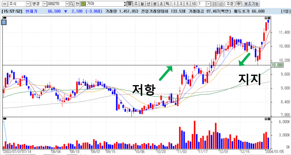 우리 상담종목인 기아죠. 이제는 다시볼수 없는 10000원대 가격인데요^^. 하여튼, 10000이란 가격이 바로 라운드피겨입니다. 때문에 10000원이란 가격을 돌파하기 위해서 얼마나 힘든지 바로 저항의 힘을 차트상으로도 보이실 거라고 봅니다. 그러면서 10000원 가격대에서 엄청난 거래량을 일으키면서 다양한 단타세력들이 치고 받는 모습도 보일거고 바로 이 부분이 정말 쉽게 꿀빨수 있는 부분이죠. 그러면서 일단 저항을 돌파하면 왠만해서 그 이하로 밀리지 않습니다. 이게 바로 라운드피겨값의 힘인거죠. 라운드피겨가 가장 드라마틱하게 나타나는 가격대가 바로 10000원입니다. 왜냐하면 가격 변동폭이 가장크고 접근하기 만만하기 때문이겠죠.