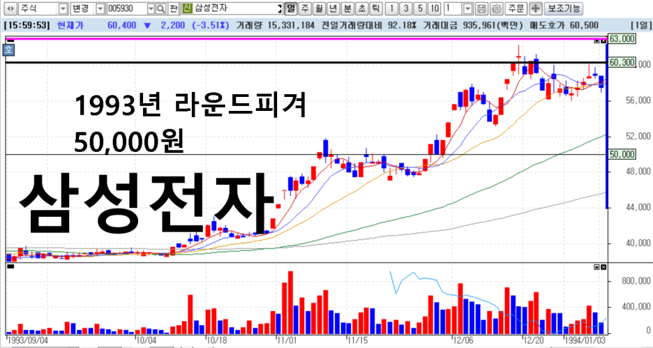 하나더 볼까요. 이제 라운드피겨 꿀빨기는 끝났으니....진짜 호랑이 담배피던 시절 1993년 라운드피겨값을 봅시다. 차트에서 수정주가를 적용하지 않으면 그당시의 주가추이를 오리지날 버전으로 볼수 있습니다. 1993년 당시 삼성전다가 5만원대에서 어떻게 움직이는지 봅시다. 앞서 살펴본 라운드피겨값의 특징과 너무나 똑같이 진행되지 않습니까? 그당시에도 저런게 존재했고 지금도 존재해서 다들 꿀빨고 있었다고 생각하니 모르신 분은 억울하지 않나요?