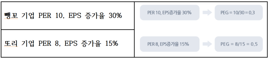 이를 좀더 개량화 해서 투자전략으로 생각해 보면, PEG란 개념으로 설명할수 있는데, 지난 종목용어 에서도 언급했지만 PEG는 PER를 EPS의 증가율로 나눈 값입니다. 즉 '뺑꼬'라는 기업이 PEG 값이 0.3 이고 '또리'라는 기업이 PEG값이 0.5라면 일반적인 투자자들의 생각과 다르게 또리라는 기업이 뺑꼬 보다 더 저평가 되었다고 봐야하는 겁니다.