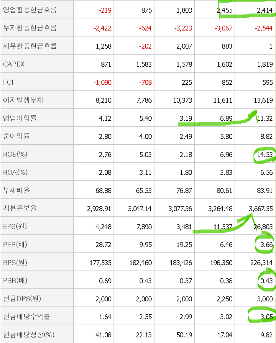 일곱. 강력한 펀더멘털 을 가지고 있는 종목은 저PER일때 매수하면 매우 유리한 지점을 선점하고 투자를 이끌어 갈 수 있습니다. 때문에 이런 강력한 펀더멘털을 고려할때 가장 중요한 지표는 바로 영업이익과 매출입니다. 영업이익이 높다는 것이 앞으로 저PER가 적정PER로 복귀할수 있다는 근거가 되고, 이는 바로 배당수익의 상승으로 연결되기 때문이죠. 또한 현금흐름과 ROE값도 강력한 펀더멘털을 추정할 수 있는 좋은 지표이기도 합니다.